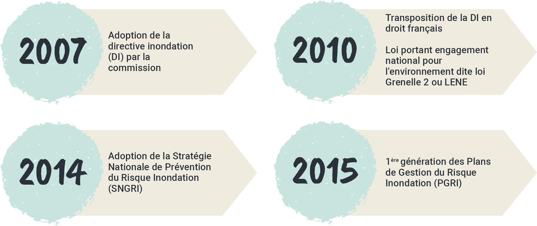 L’Evaluation Préliminaire des Risques d’Inondation (EPRI) a conduit à l’identification des Territoires à Risque Important d’Inondation (TRI), à la cartographie des risques sur ces territoires prioritaires puis enfin à l’élaboration des Plans de Gestion des Risques d’Inondation (PGRI).