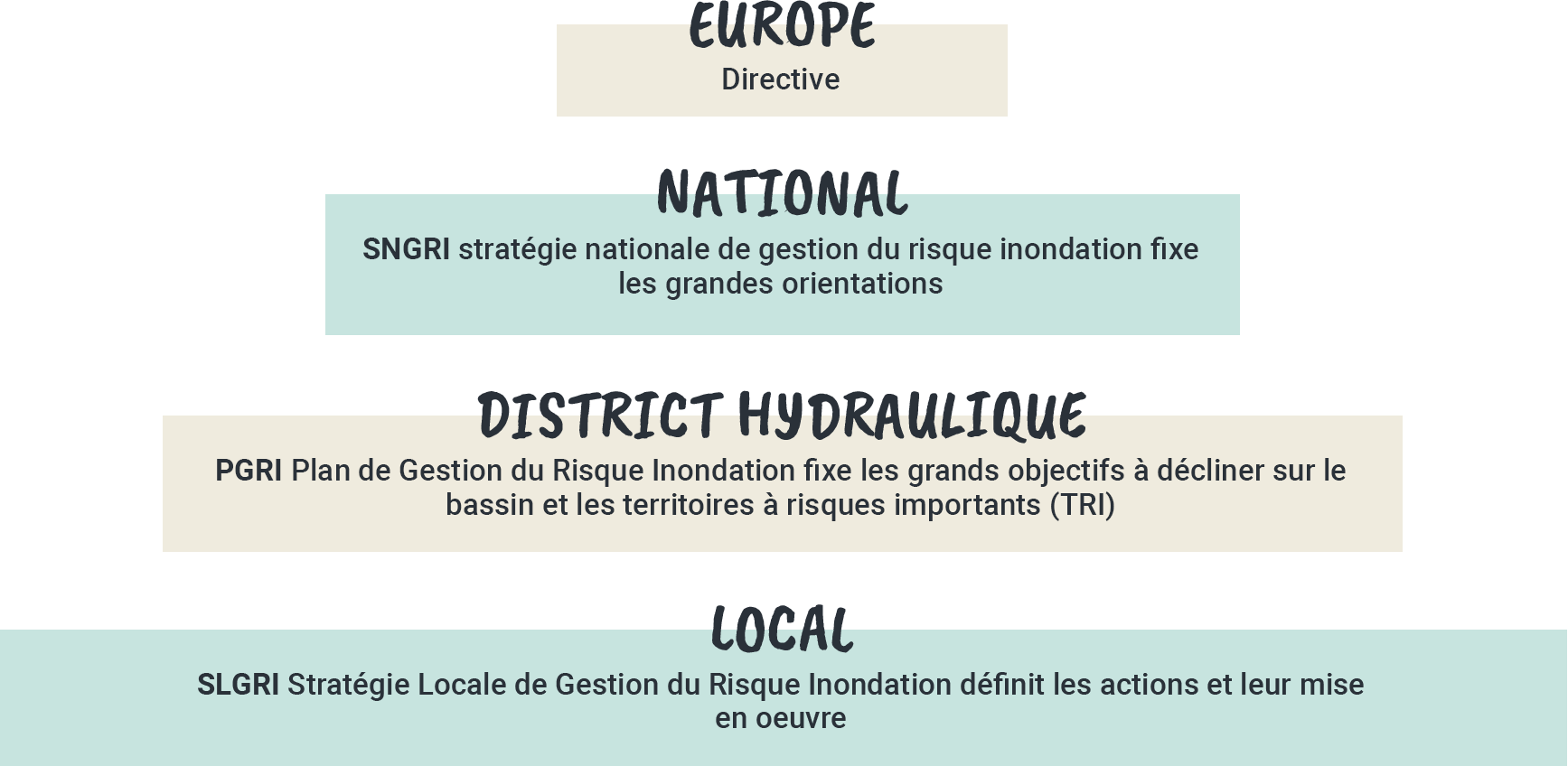 Sur chacun des TRI, les collectivités compétentes ont la charge d’élaborer des Stratégies Locales de Gestion du Risque d’Inondation (SLGRI). La mise en œuvre opérationnelle de ces stratégies est ensuite réalisée à travers des Programmes d’Actions de Prévention des Inondations (PAPI).![]()