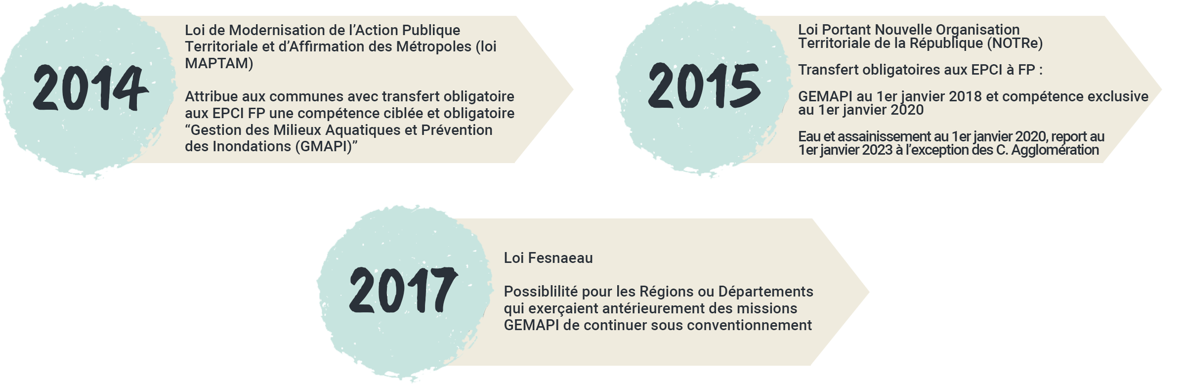 Le législateur a ainsi attribué au bloc communal, avec transfert aux EPCI à fiscalité propre, une compétence exclusive et obligatoire de Gestion des Milieux Aquatiques et de Prévention des Inondations (compétence GEMAPI) comprenant les missions relatives à la gestion des milieux aquatiques et de prévention des inondations, définies aux points 1°, 2°, 5° et 8° du I de l’article L.211-7 du Code de l’Environnement :