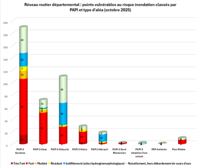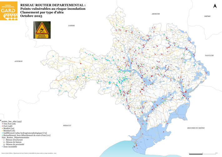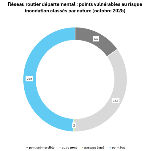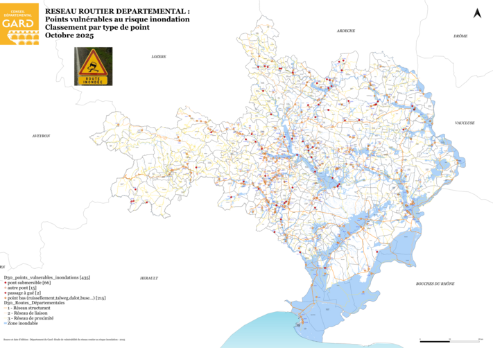 Le Conseil départemental a conduit en 2024/2025, une étude visant à identifier et parfaire la connaissance de la vulnérabilité des portions du réseau routier départemental régulièrement inondées (selon les connaissances des agents des unités territoriales) pour in fine étudier les conditions d'une meilleures sécurisation pour les usagers.