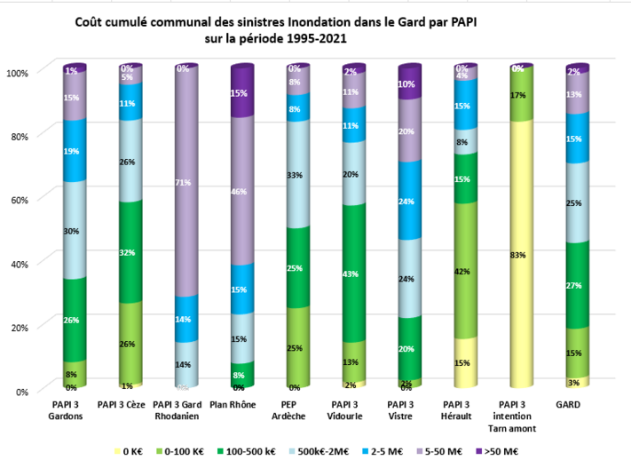 Seulement 3% des communes (11 communes) n’ont pas eu de sinistre répertorié sur la période 1995 et 2021 (localisées essentiellement sur les bassins Tarn-Dourbie et Hérault).
