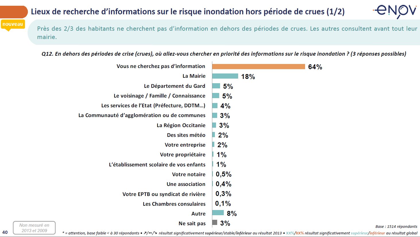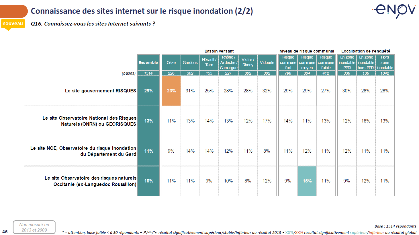 Les sites internet sur le risque inondation sont encore peu connus : le site internet RISQUES est le site bénéficiant de la plus grande notoriété, mais n’est connu que par 29% des habitants et la notoriété des autres sites internet ne dépasse pas les 13%. A noter que 11% connaissent le site NOE.