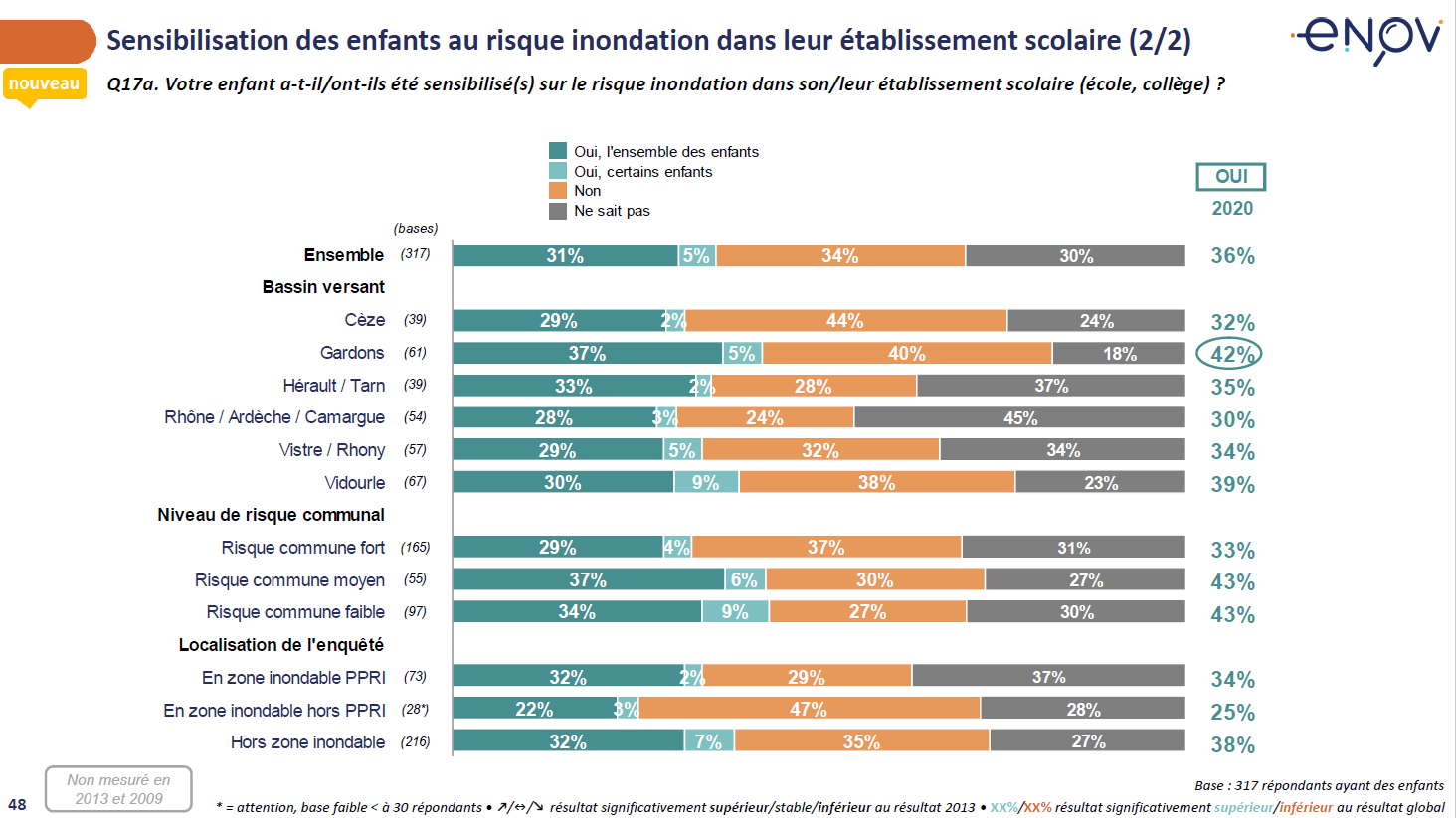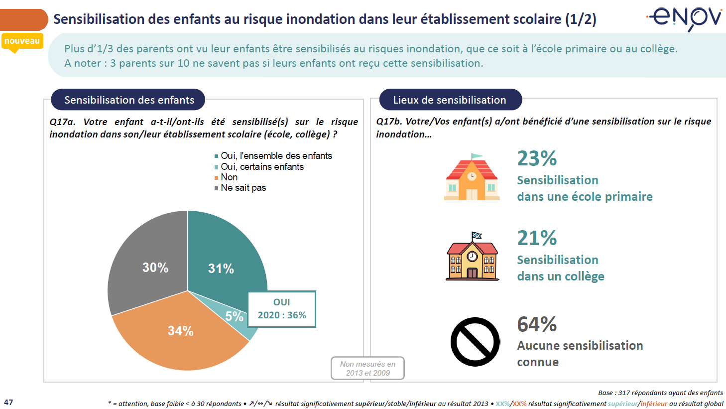 Enfin, 36% des parents savent qu’au moins un de leur enfant a été sensibilisé au risque inondation (et 30% ne savent pas si cette sensibilisation a eu lieu).