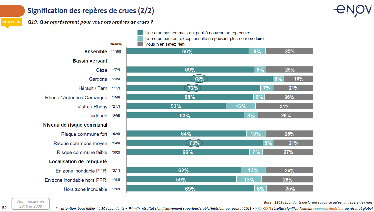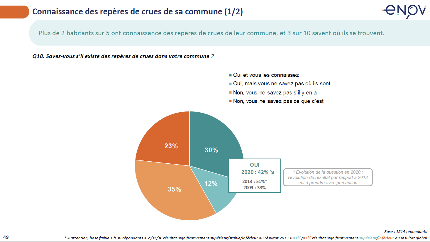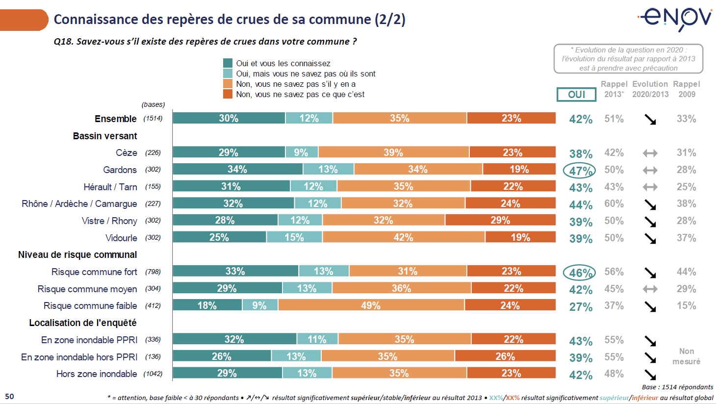 Les repères de crues ne sont connus que par 42% des habitants (dont 12% ne sachant pas exactement où ils se trouvent). Ce chiffre ne dépasse jamais les 50%, quelle que soit la zone étudiée, y compris dans les communes à fort risque (46%) et dans les zones inondable PPRI (39%). Parmi ceux qui connaissent ces repère de crues, ¼ ne savent pas exactement à quoi ils correspondent.