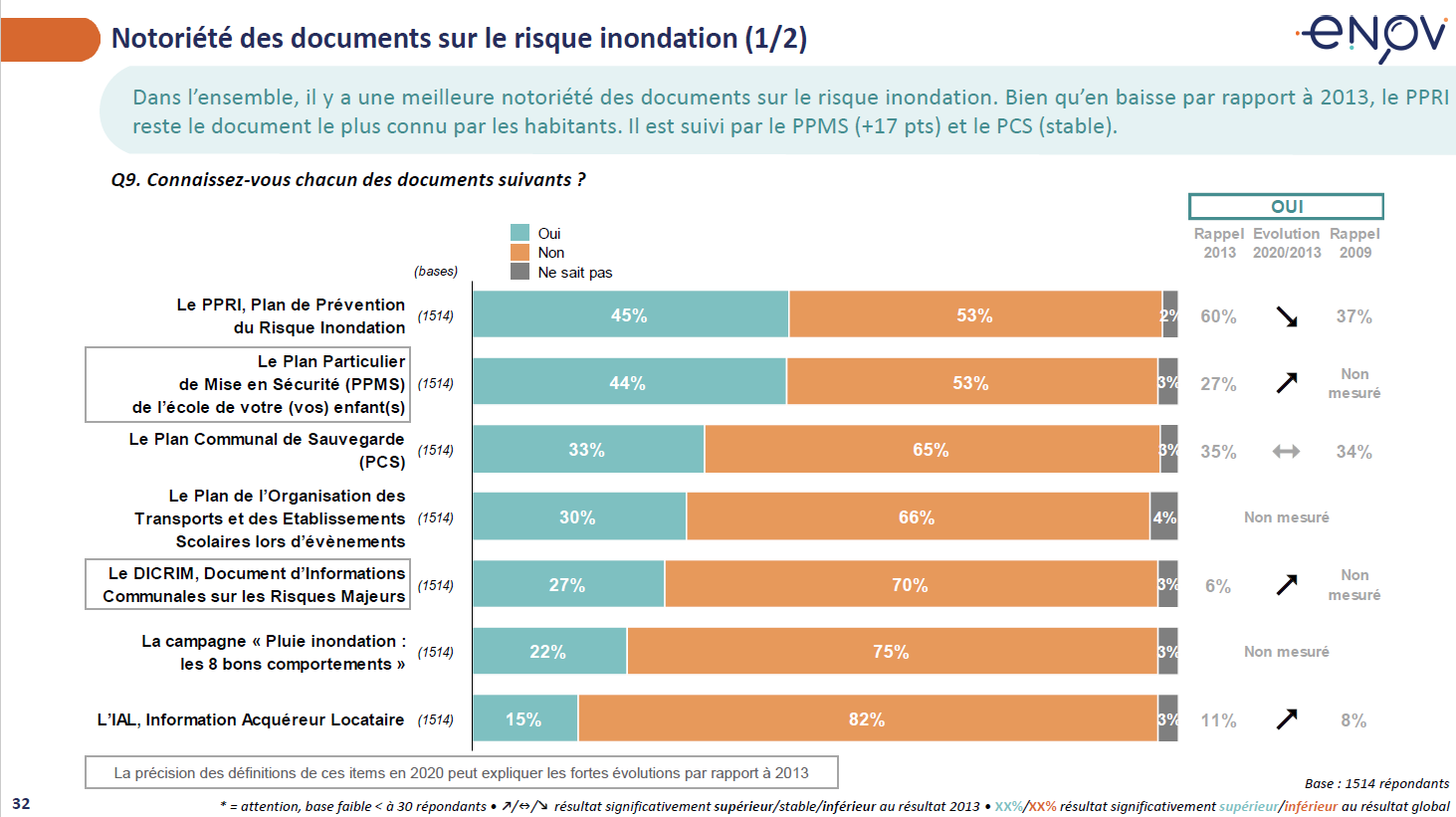 La connaissance du Plan Particulier de Mise en Sécurité (PPMS) des écoles a bien progressé (44%, +17 pts) ainsi que celle du DICRIM (27%, +21 pts) alors qu’on observe une diminution importante de celle du Plan de Prévention du Risque Inondation (PPRI) (45%, -15 pts). A noter aussi l’impact des campagnes « Pluie Inondation » qui obtiennent un bon résultat (22%).