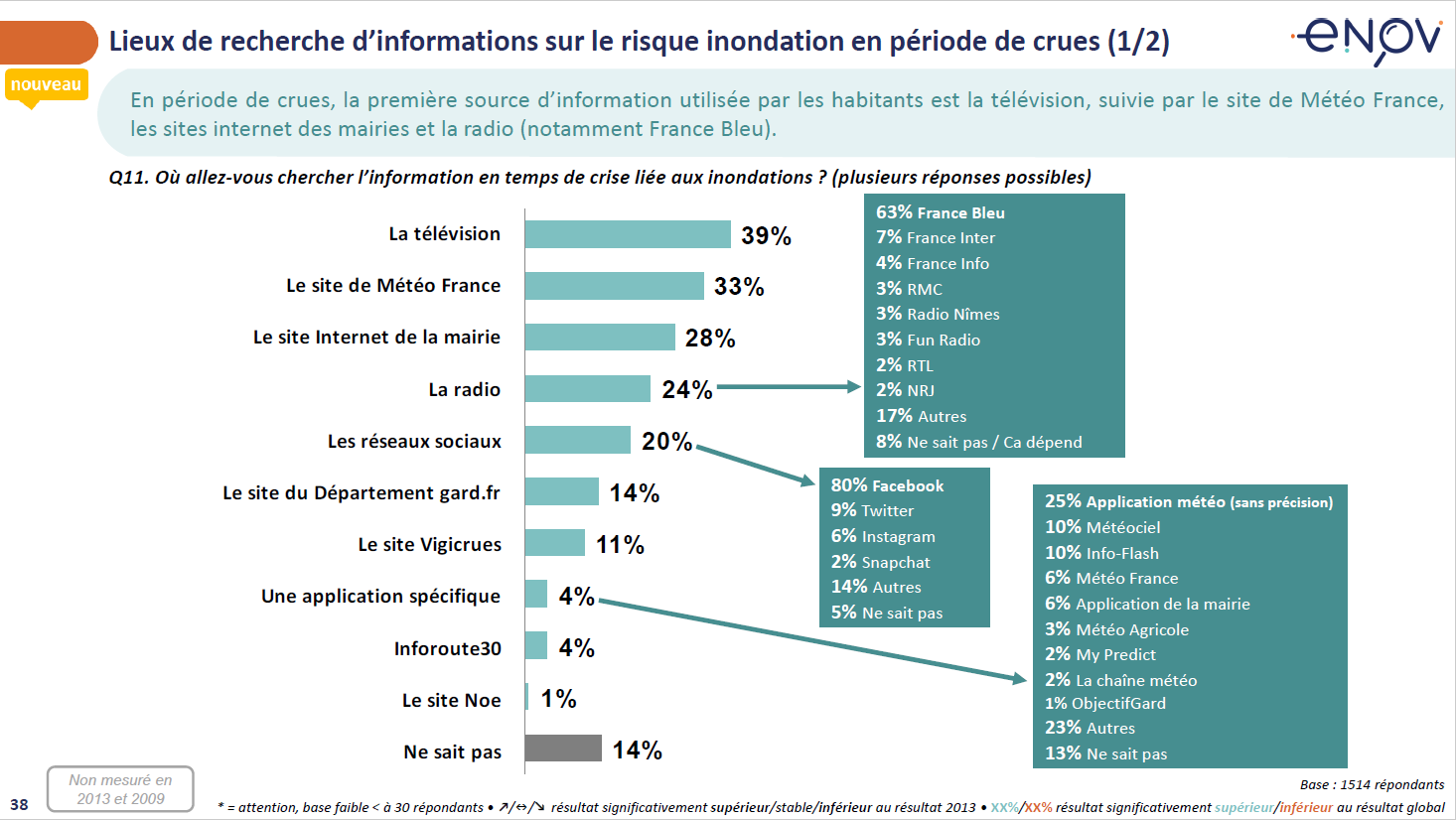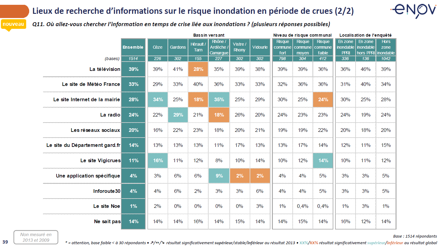 Toujours en période de crues, lorsque les habitants effectuent eux-mêmes des recherches d’informations, ils utilisent en premier lieu la télévision (39%), le site de Météo France (33%), le site internet de leur mairie (28%) et la radio (24%, surtout France Bleu). 20% regardent les réseaux sociaux (Facebook...), 14% vont sur le site du Département et 11% sur le site Vigicrues.