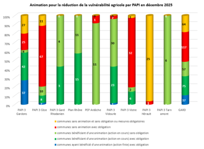Sur le PAPI Gardons, 27% des communes ont bénéficié d'une opération de réduction de la vulnérabilité agricole (opération finie) et 34% bénéficie d'une opération en cours menée par l'EPTB Gardons avec le bureau d'étude OSGAPI et avec la chambre d'agriculture du Gard pour les communes du Plan Rhône .