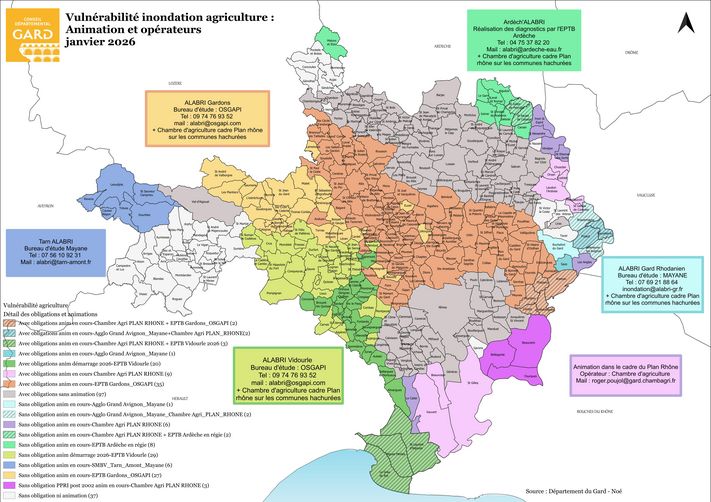 - Dans le cadre des démarches ALABRI, ETPB Ardèche, l'agglomération du Grand Avignon, le Syndicat mixte du bassin versant du Tarn Amont et EPTB Gardons (avec une priorisation sur les communes de l'Uzège et du bas Gardon), accompagnent les agriculteurs (ayant moins de 20 salariés) du diagnostic au paiement des suventions. Si les diagnostics sont gratuits, les travaux quant à eux sont subventionnables par l'État à hauteur de 40% dès lors qu'ils sont rendus obligatoires par un PPRi ou qu'ils figurent sur la liste de travaux éligibles.