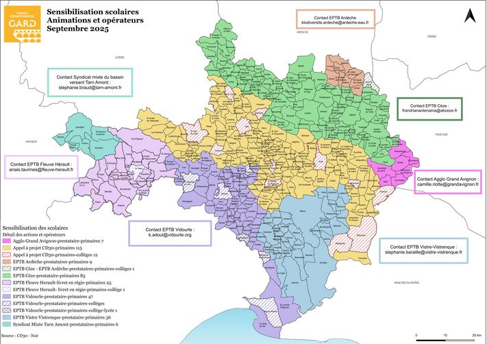 A ce jour, les EPTB Vidourle, Vistre-Vistrenque, Ab Cèze, Ardèche  mais aussi le Syndicat Mixte du bassin versant du Tarn Amont et l'agglomération du Grand Avignon conduisent chacun en maîtrise d'ouvrage, un dispositif de sensibilisation dont l'animation est confiée à des prestataires extérieurs. L'EPTB du Fleuve Hérault a élaboré un cahier pédagogique pour les primaires et collégiens qu'il met à disposition des enseignants. Le Conseil départemental du Gard quant à lui intervient sous forme d'appel à projet sur les territoires orphelins. Pour l'année scolaire 2025/2026 , le projet du CPIE du Gard a été retenu.